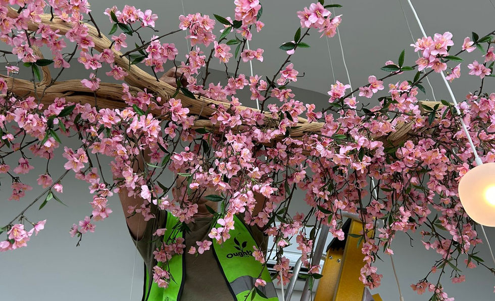 For Office Innovations' newly designed salon, we provided a bespoke faux planting solution that seamlessly blends nature with artificial planting. Handcrafted to meet the design brief, each installation was made from fire-rated materials to ensure both beauty and compliance. The centerpiece features include a striking eucalyptus archway and light pendant, adding a refreshing, organic touch to the salon's atmosphere. Additionally, we created a natural hanging driftwood rafter adorned with delicate cherry blossoms, designed to move gently with the environment, bringing a dynamic and elegant element to the space. This project highlights our commitment to delivering custom, high-quality designs that enhance and elevate any interior.